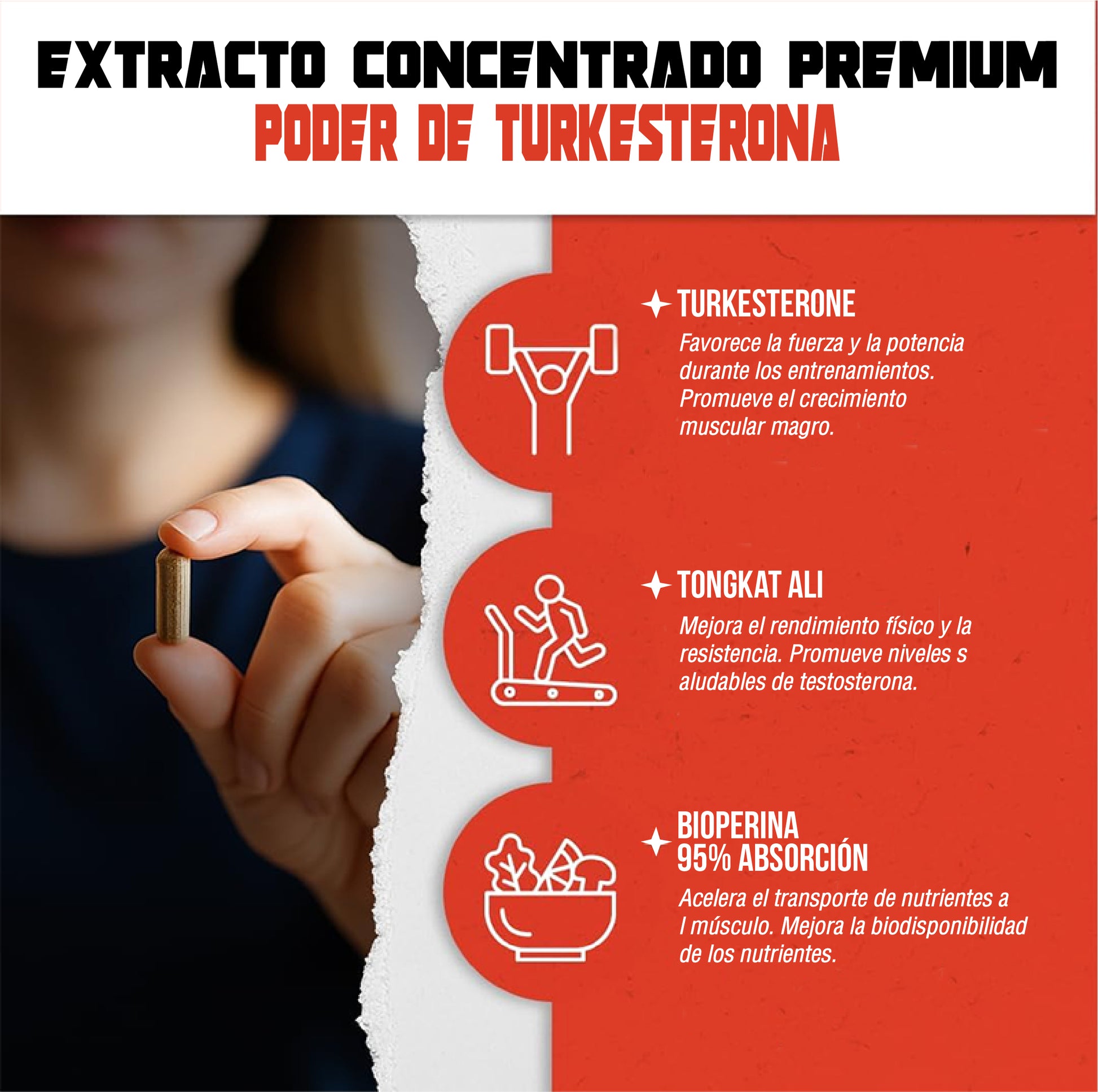 Con el suplemento de TURKESTERONA tendrás un crecimiento muscular, notarás un aumento de tu fuerza y tu rendimiento, una mejor recuperación muscular y todo esto de manera natural.